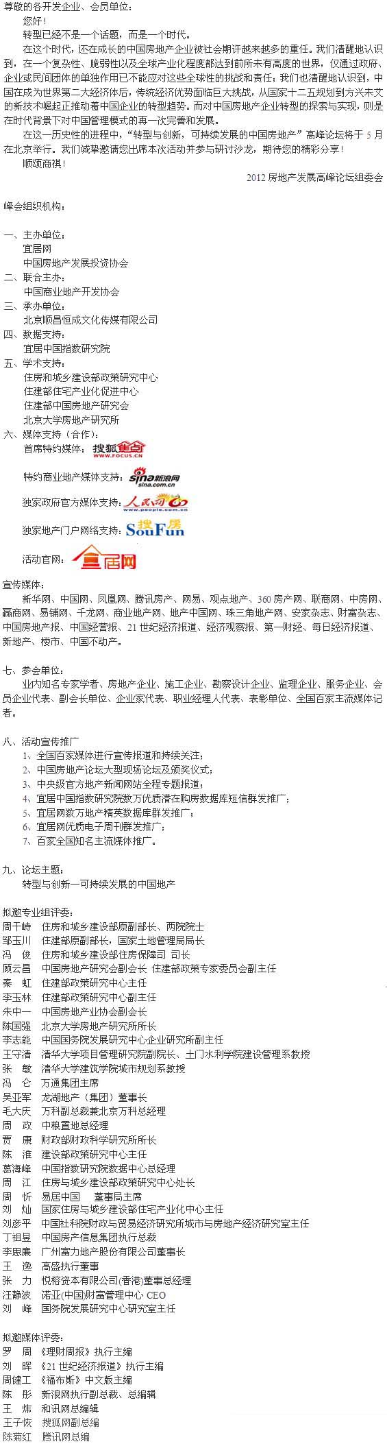 关于参加“2012中国房地产发展高峰论坛”的邀请